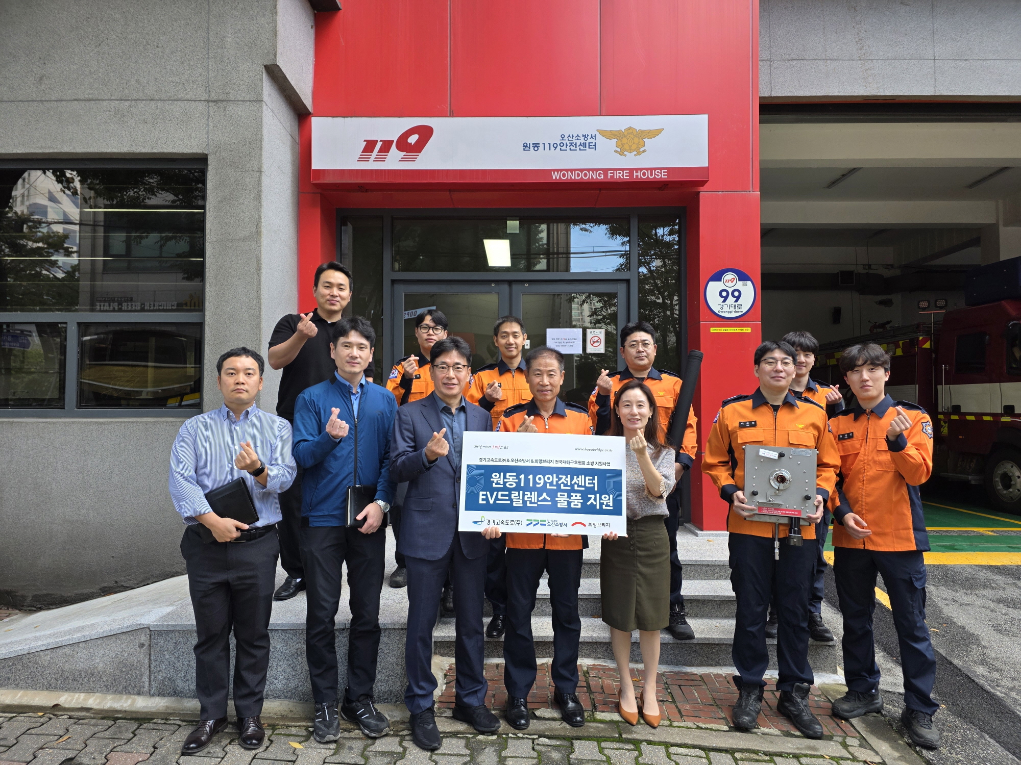 희망브리지 전국재해구호협회(회장 임채청)는 경기고속도로㈜(대표이사 윤현호)와 함께 경기도 오산시 원동119안전센터에 전기차 화재 대응 장비 ‘EV드릴렌스’를 전달했다고 22일 밝혔다.