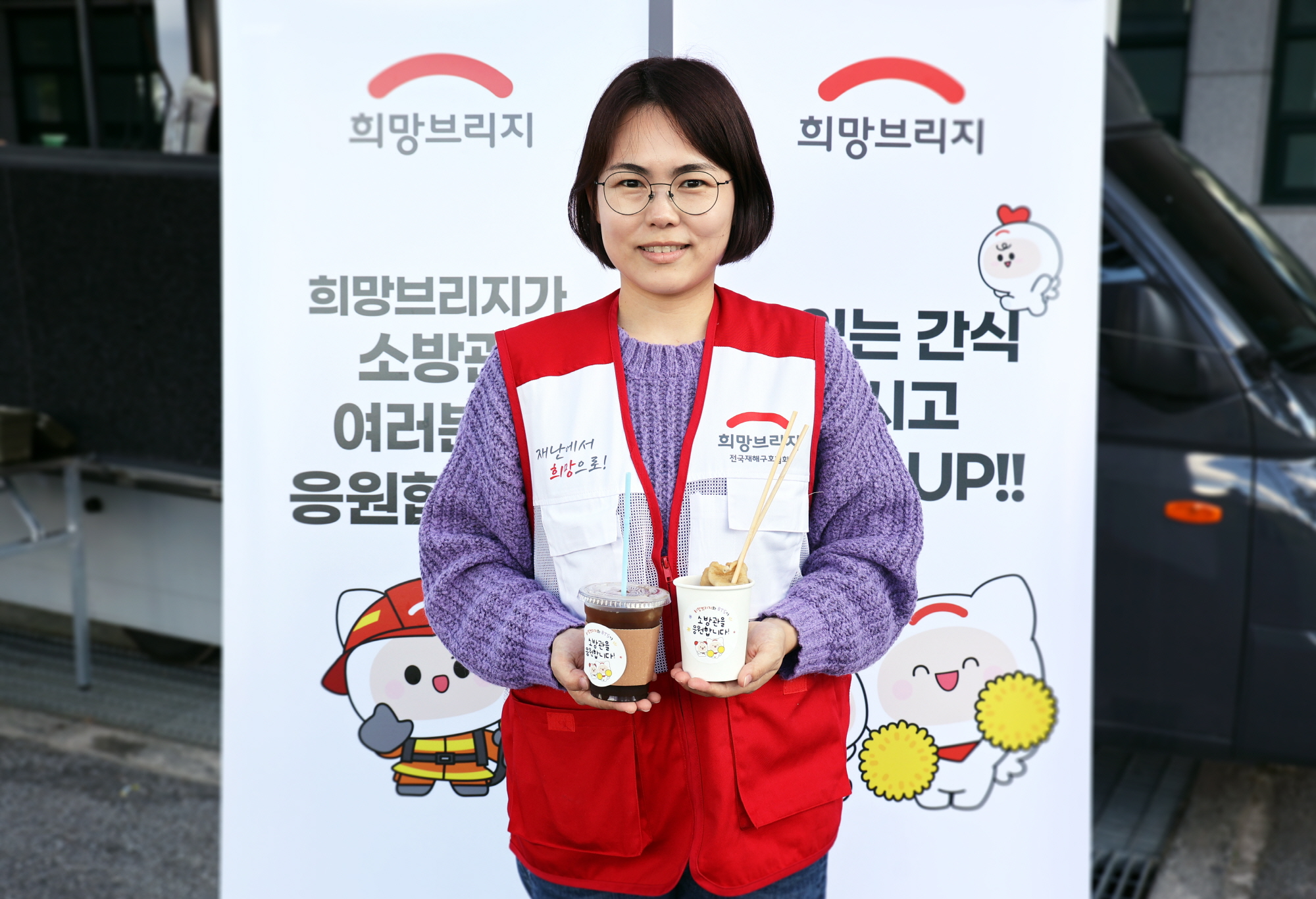 희망브리지는 재난 현장의 중심에서 국민의 생명을 지키는 소방관들의 체력 회복과 훈련 집중도를 높이기 위해 간식차를 보내 커피, 음료, 어묵 등 간식을 전달하며 ‘국민의 영웅’인 소방관들을 응원했다.
